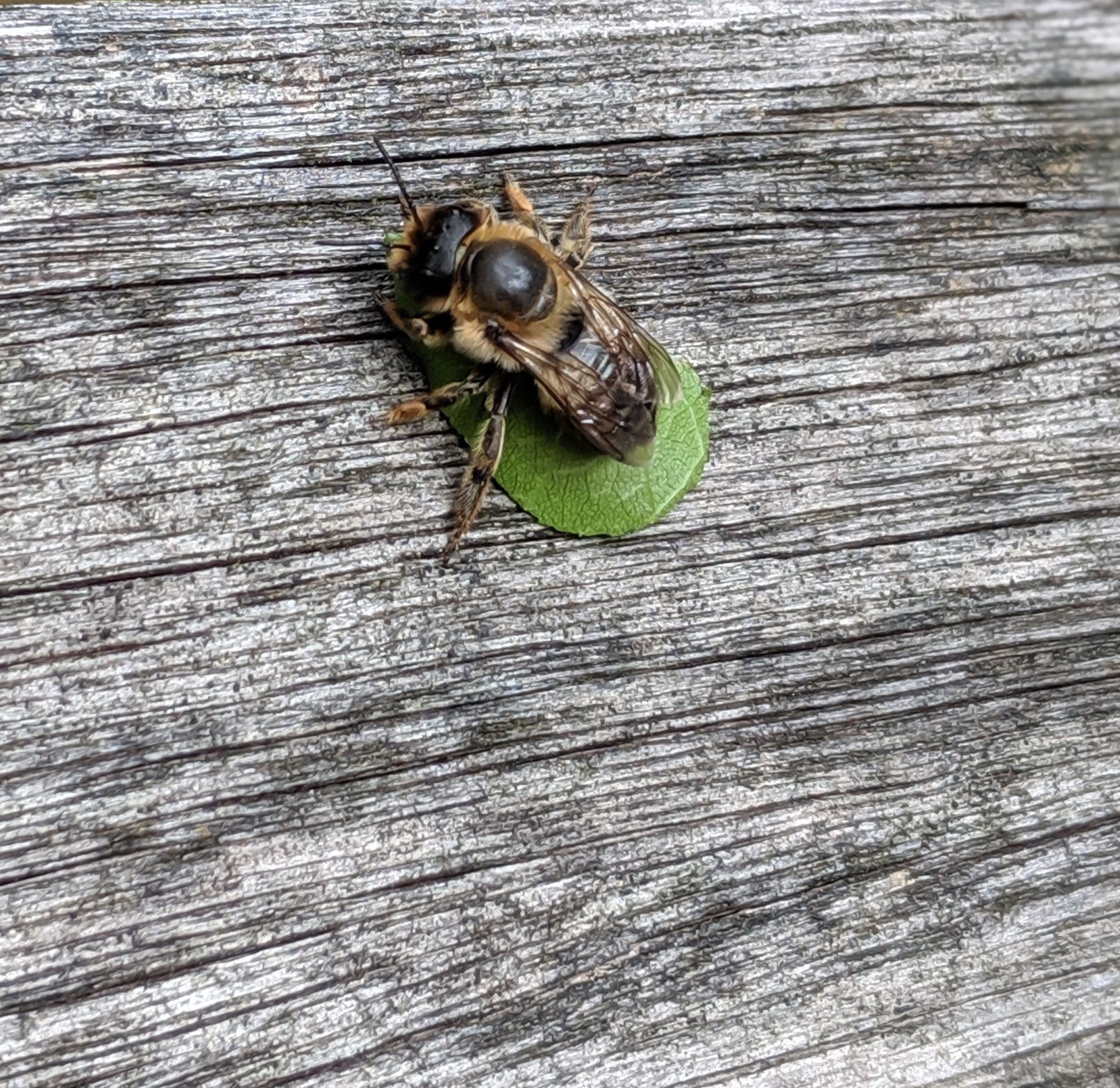 The female collects little circles of leaf, which she uses to line her nest hole. Much like the mining bees of last week, each little cell is provided with enough pollen and nectar for one larva. She lays her egg on top of the provisions, then puts a little leafy cap on that cell and starts another one.