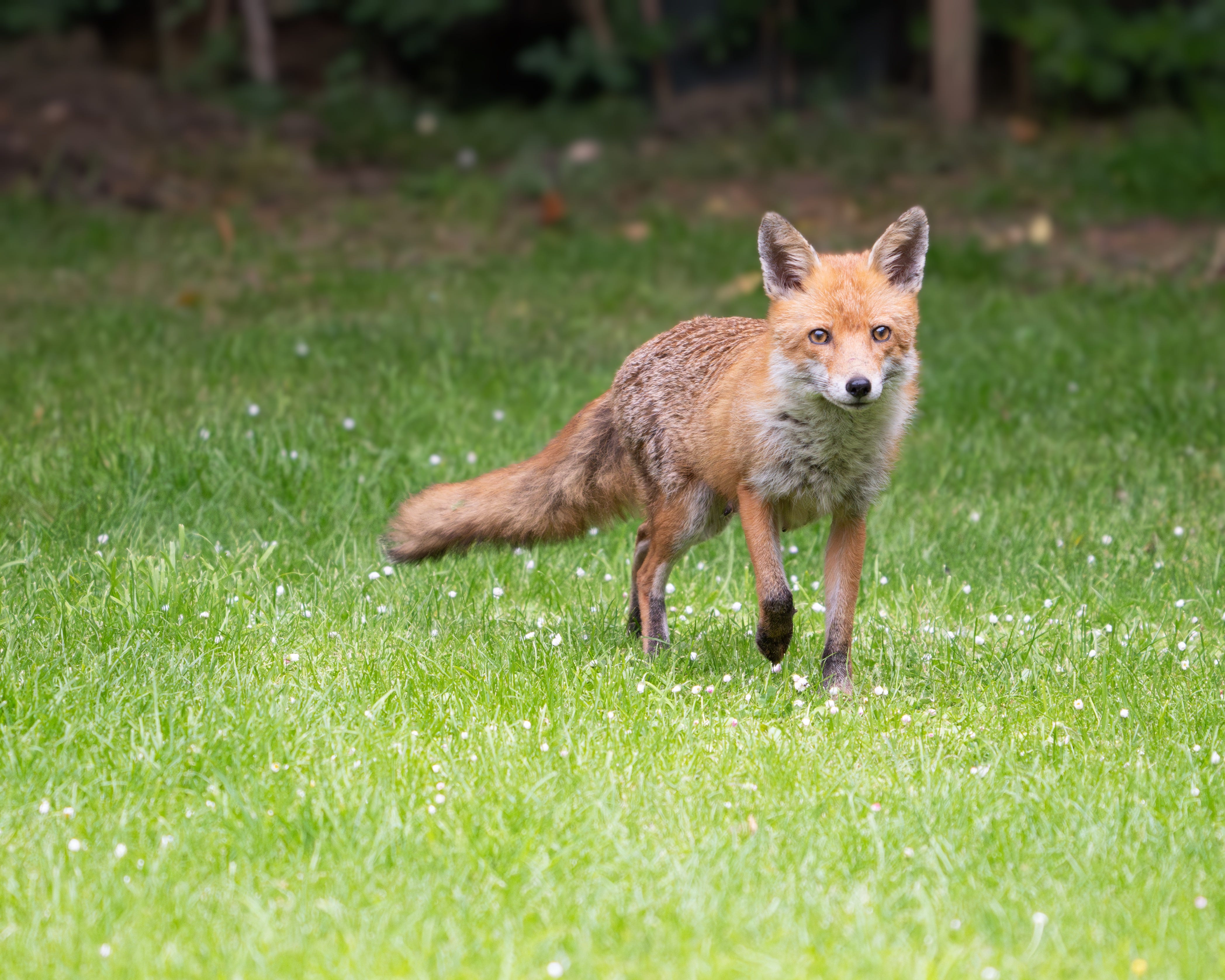 This Fox is the female – her cubs are hidden away somewhere safe. She has shown in up an awful state on more than one occasion, with an injured face and cut on her hind leg, thorny leaves stuck deep in her fur. Recently, she almost entirely lost the use of her hind leg for a few weeks. They’re resilient, though. She’s on the mend now, and still seems to be ‘top dog’.