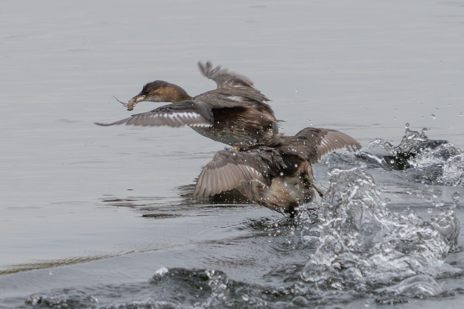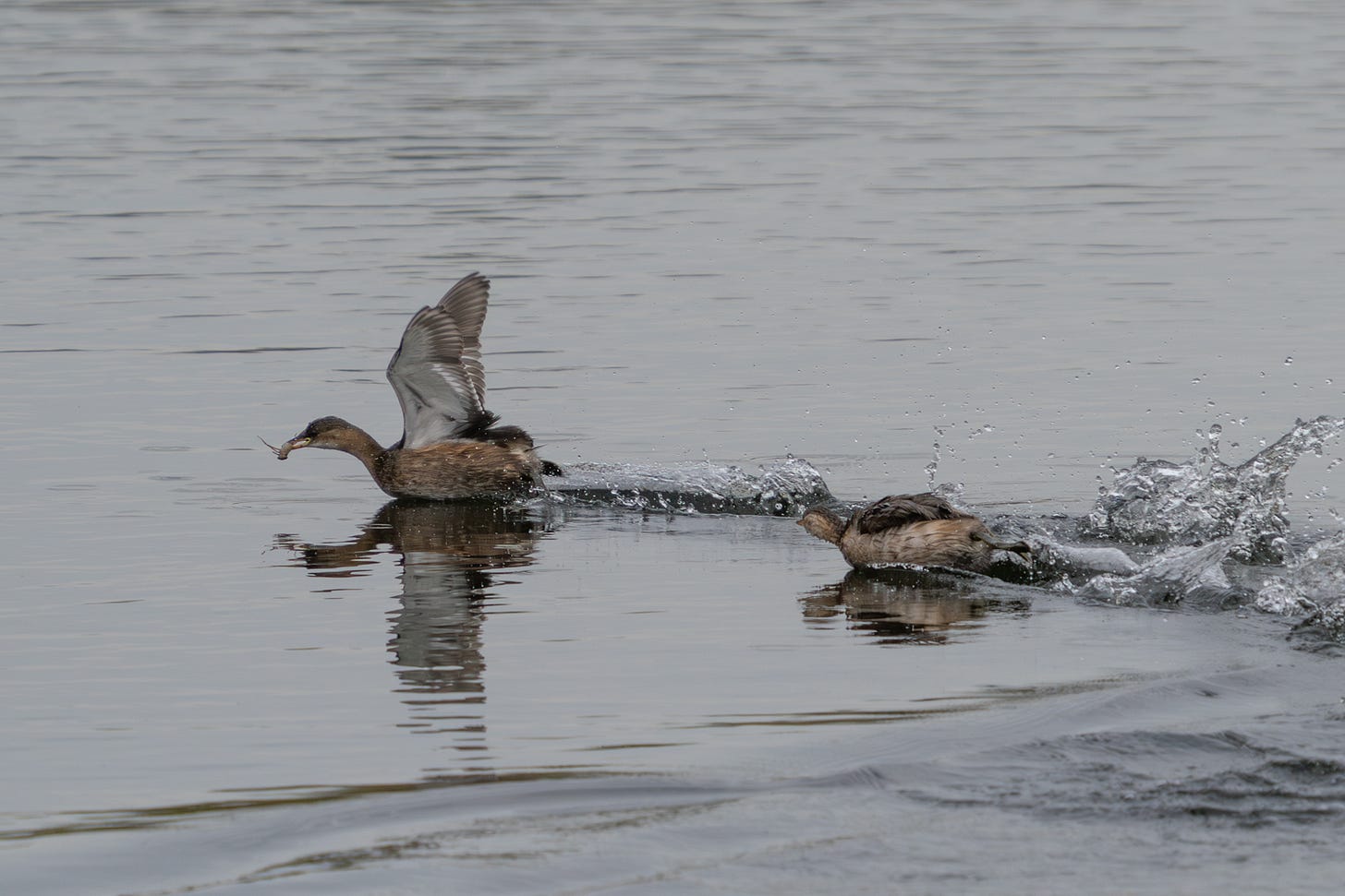 The Little Grebe, above and below, seems to have found a Crayfish in the flooded quarry. They created quite the commotion, chasing each other around in wide arcs.