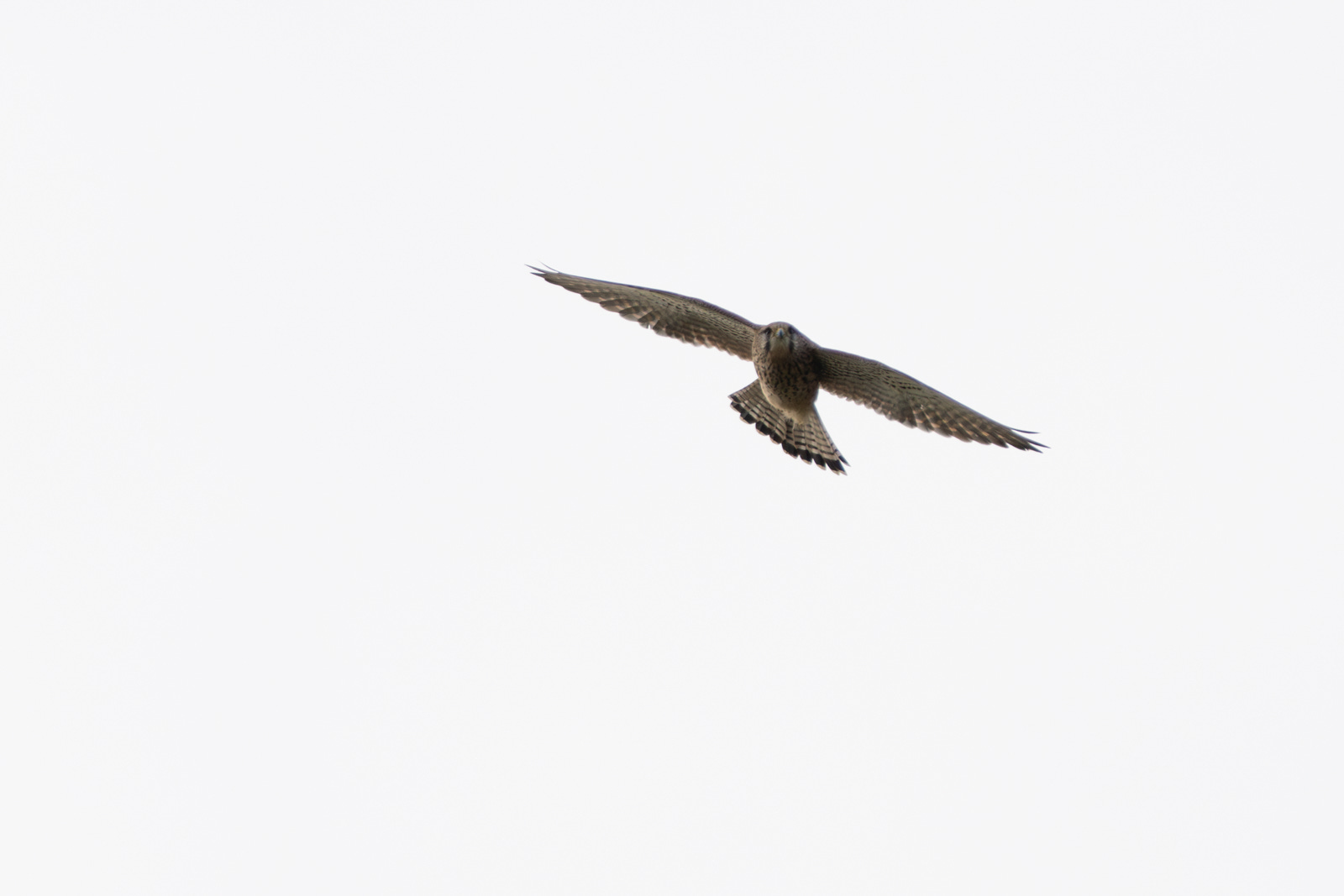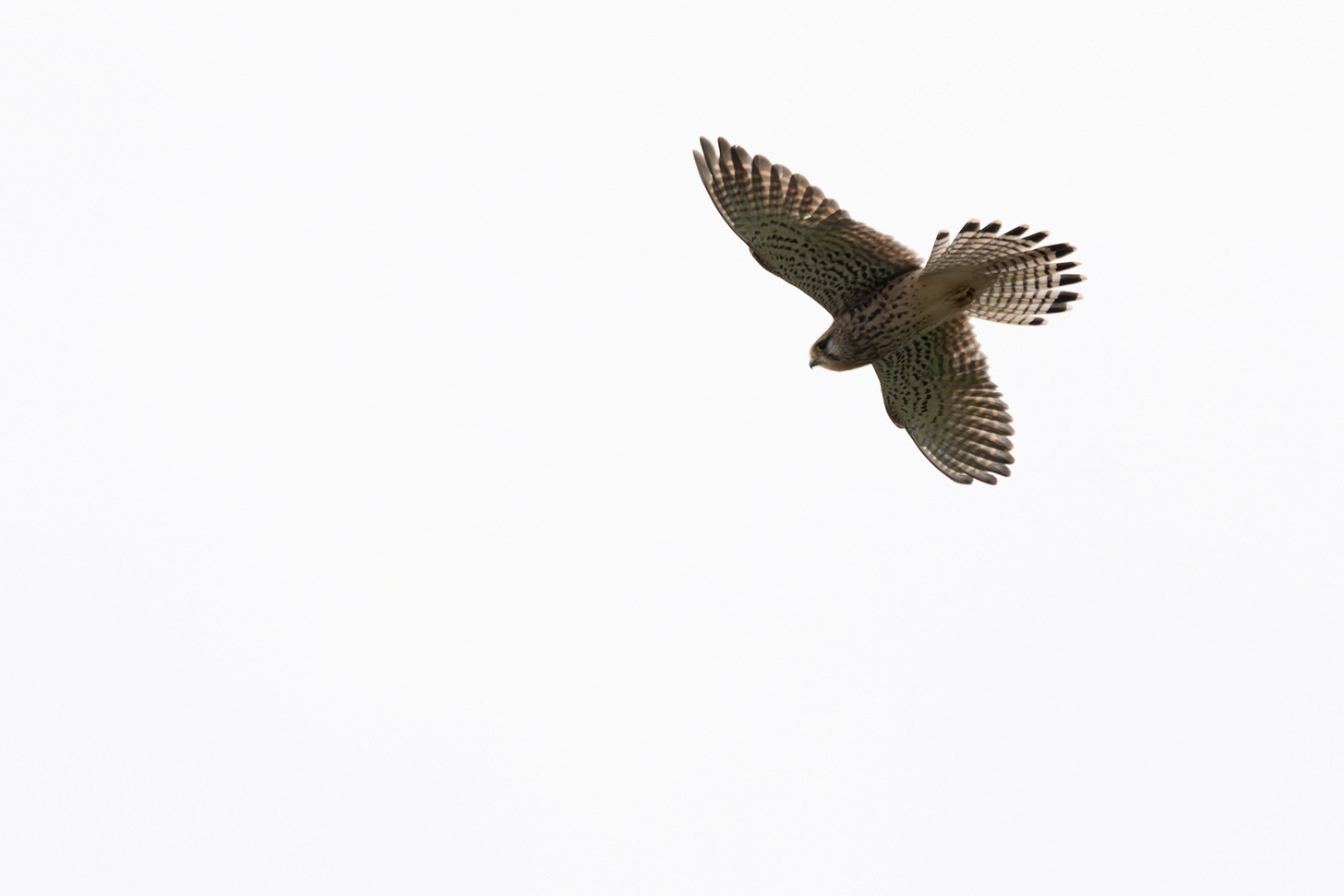 First, a Kestrel appeared on the scene like a bullet in shape and speed. The black tear-drop under her eye, the black band at the tip of the tail and that short-yet-streamlined shape tell us she’s not a Sparrowhawk.