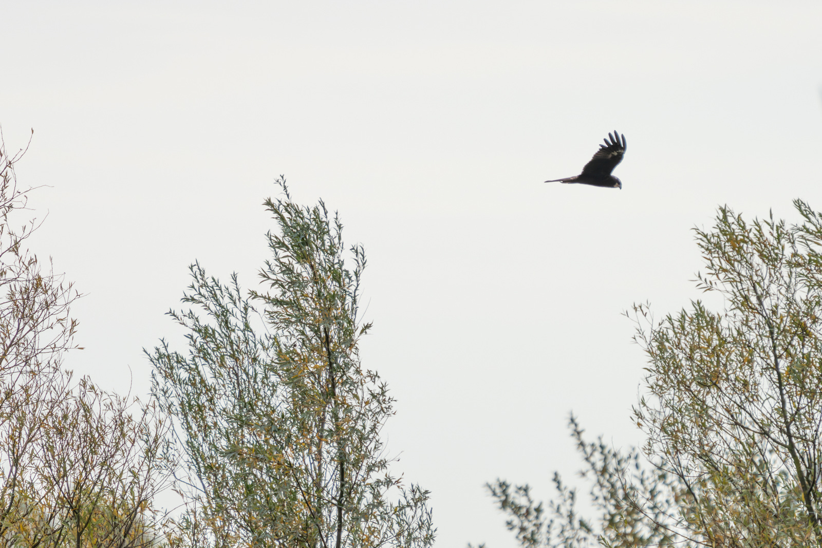 A large bird of prey appears, flying purposefully over the trees. Not the lazy flap of a Red Kite or the high-up soaring of a Buzzard, but around the same (impressive) size. It’s a wandering Marsh Harrier – a female, with chocolate brown plumage and a yellow-white crown and throat.