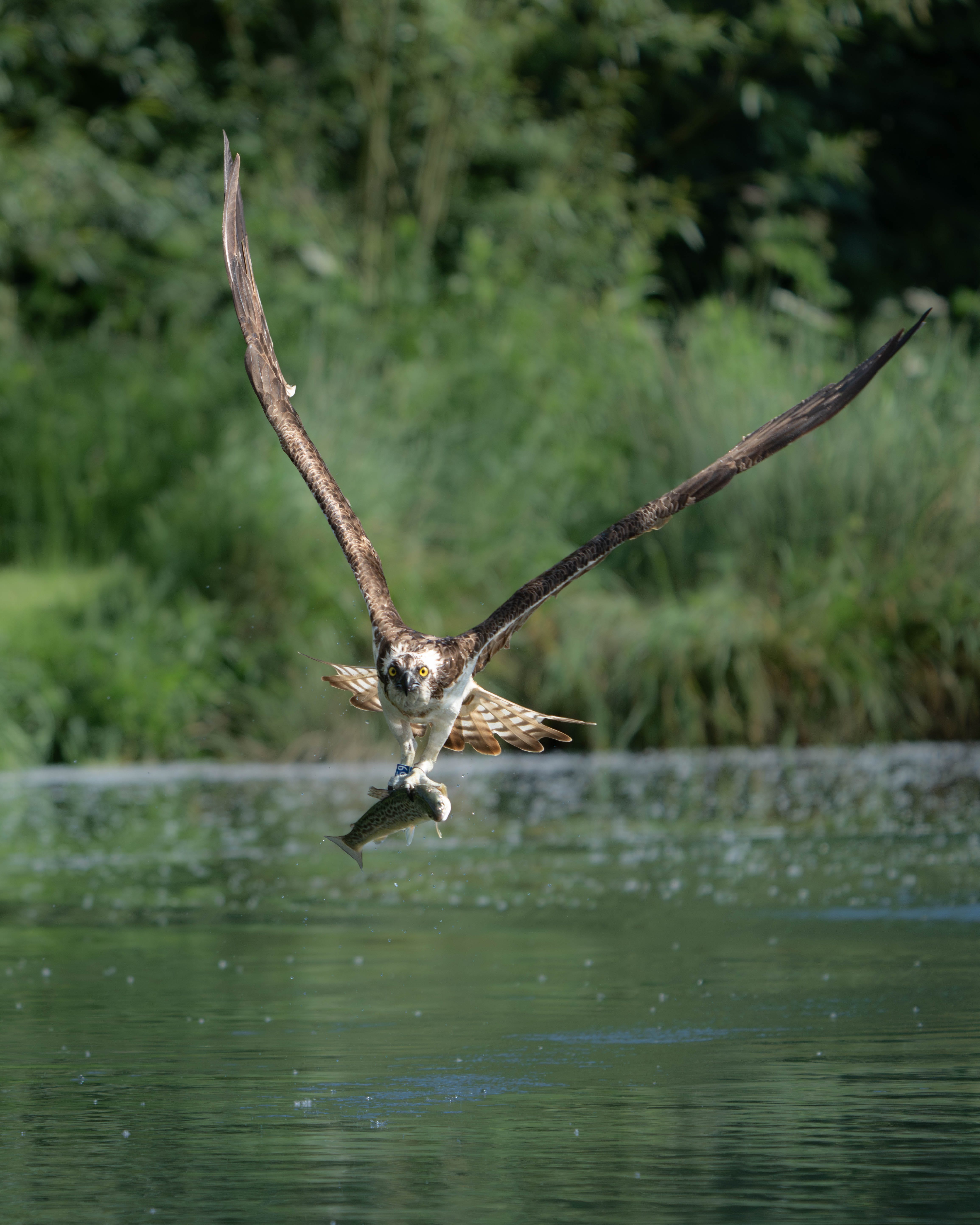 These birds will eat anything they can get their beak on. Fish, yes – but also small mammals, other birds, amphibians and reptiles. (Well… anything except a vegetable.)