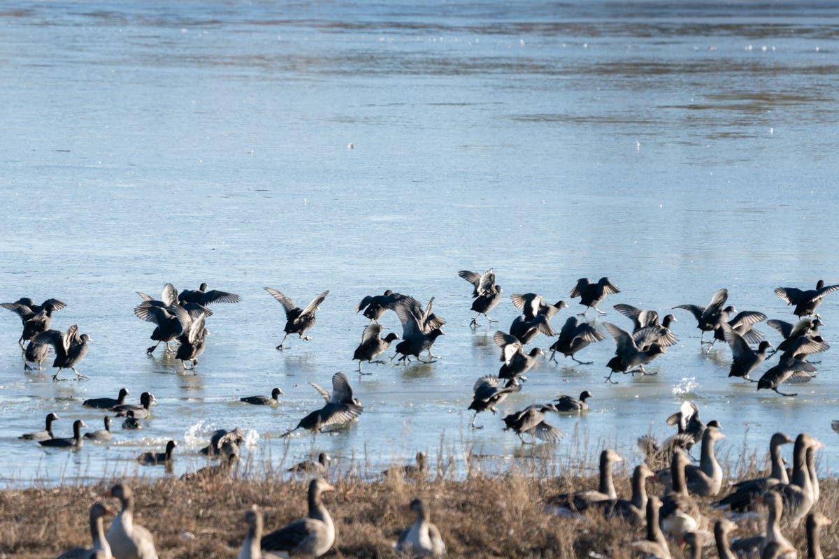 I arrived just as the Coots finished their morning meeting and scattered across the ice. The frozen water had forced the Greylags much closer to shore than usual – perfect.