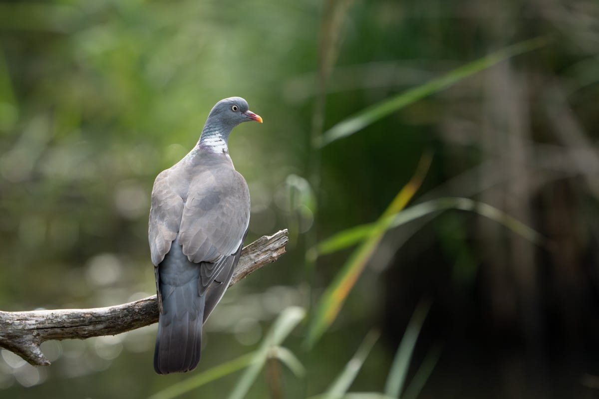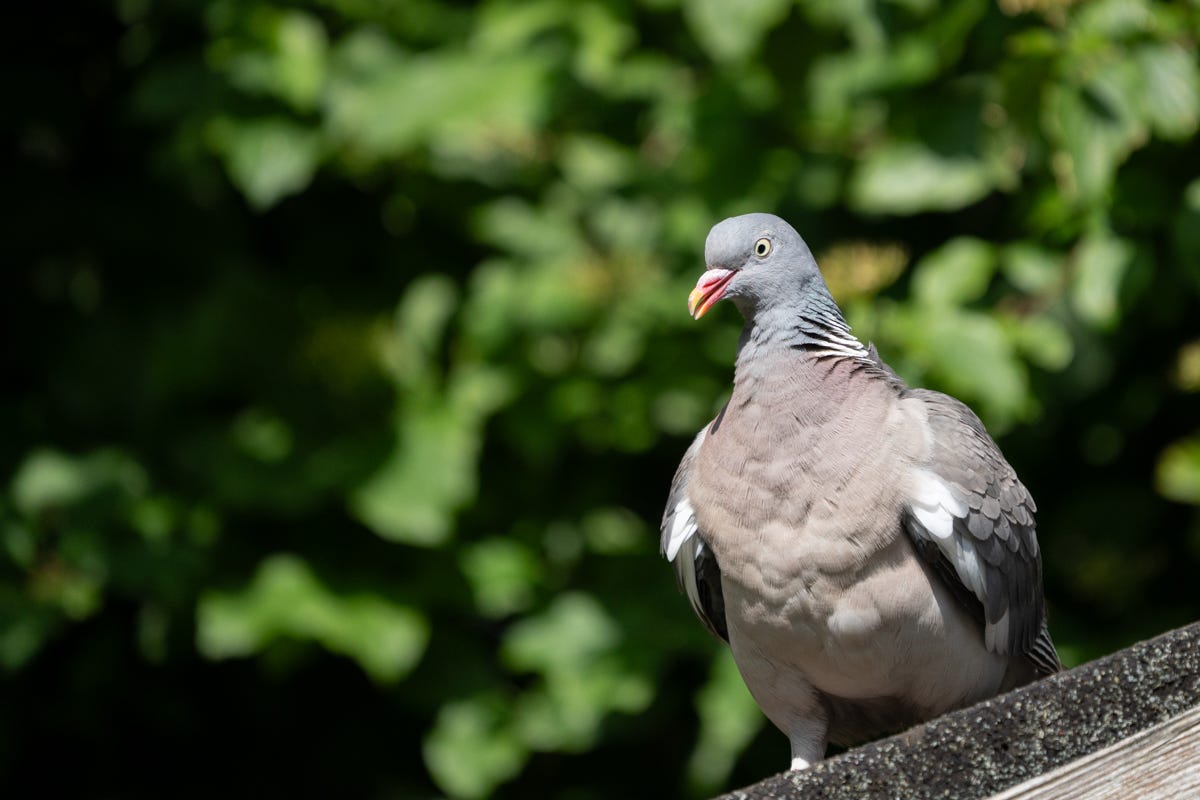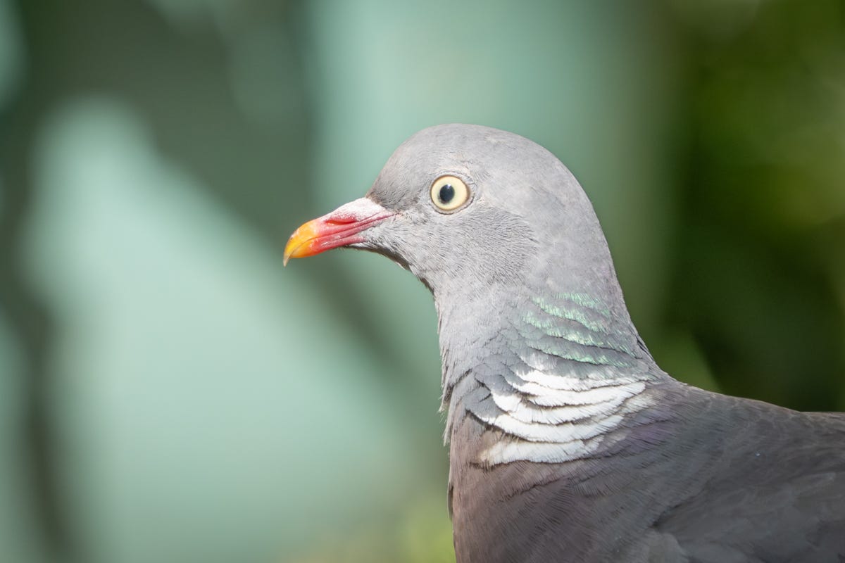 The Wood Pigeon is not just the largest of all our pigeon species, it is much rounder than the rest, too. Their beaks start out greyish and weirdly bulbous as chicks, but turn candy yellow and red as they mature. Their eyes also change as they become adults, from dark grey to yellow with a black pupil that has a characteristic ‘smudge’ at the bottom.