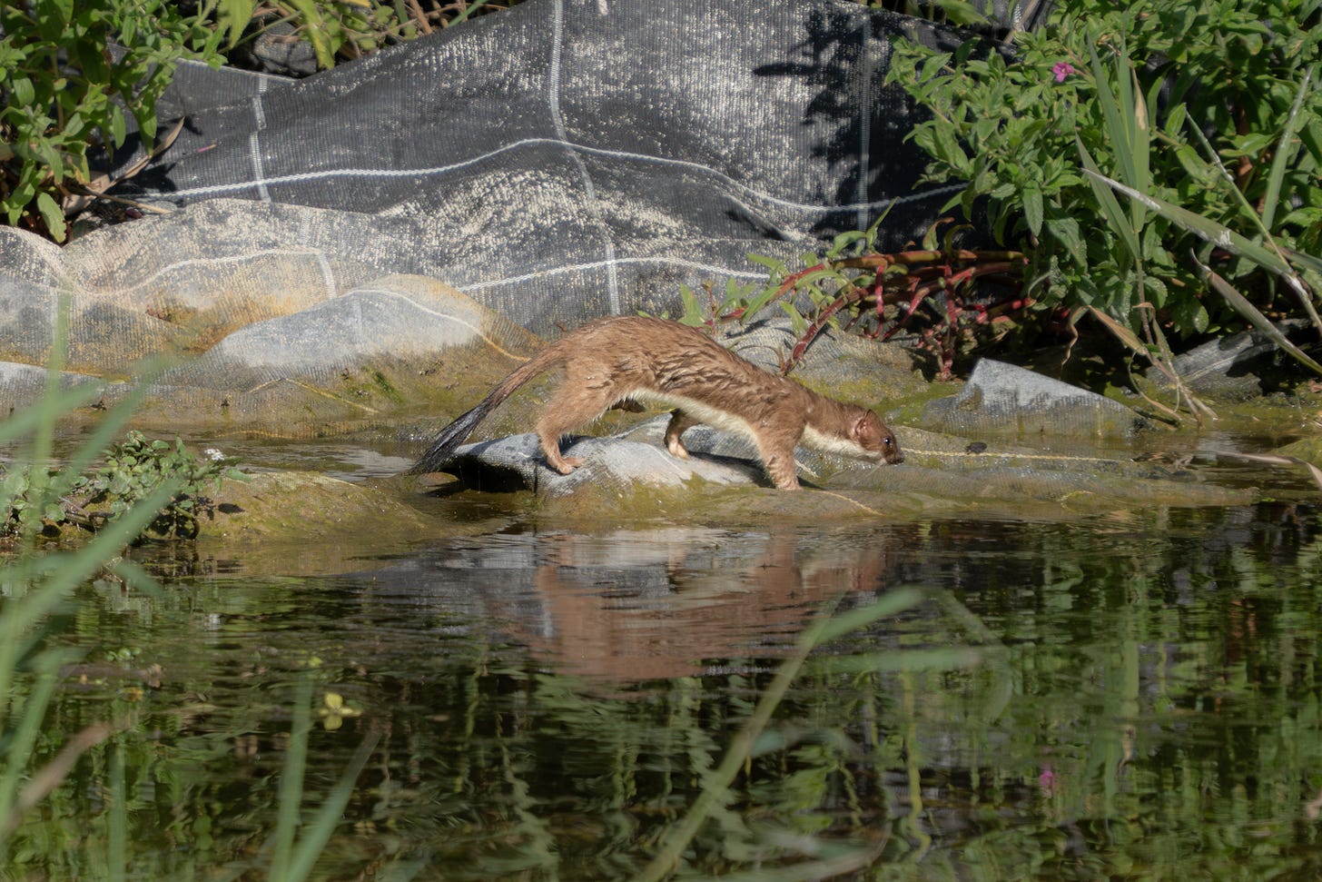 The Mallards and Moorhens nearby kept a very close eye on its antics, but the Stoat wasn’t thinking about food.