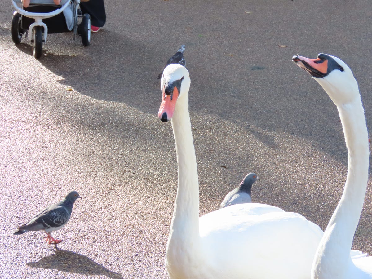 We created our own throng with a scattering of peanuts, and as I knelt to hand-feed the pigeons, Greylag, Egyptian and Canada Geese, a lumbering presence appeared out of the water. A Mute Swan! Rumoured to have strength enough to ‘break a grown man’s arm’, there is actually no record of this ever having happened. But you do have to wonder…