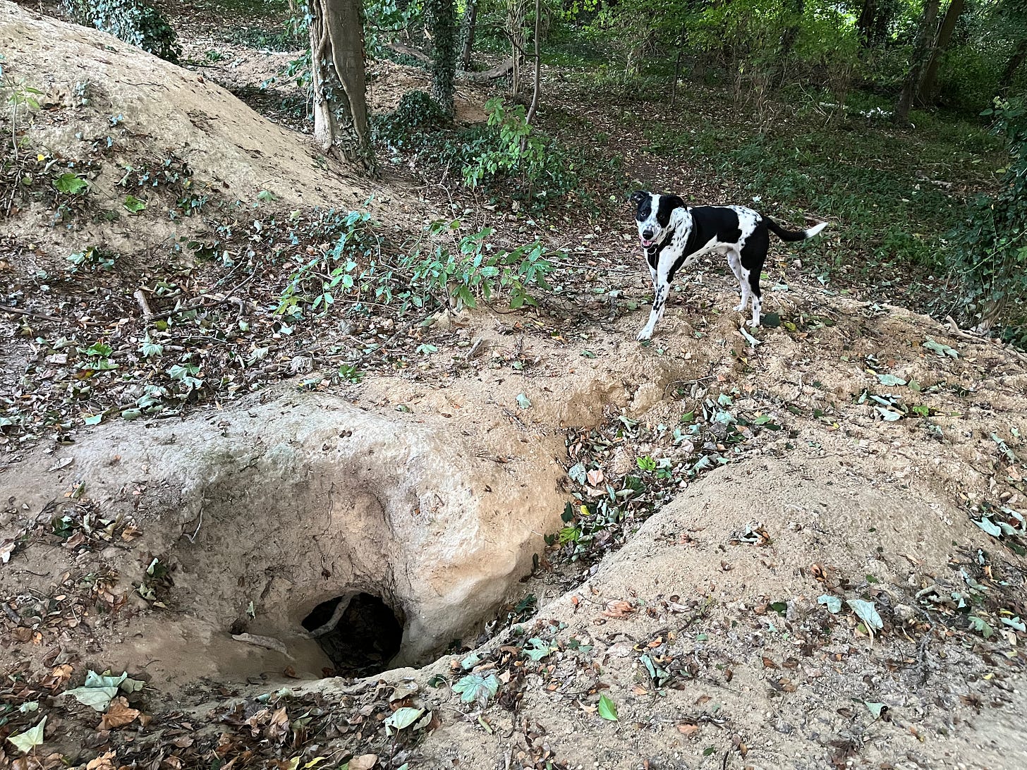 Jasper was proud to find this (disused) Badger sett. I often wonder what he’d make of badgers (and what they’d make of his badger-face markings!). What did you see, while I was scampering in the woodland with Jasper this week?!