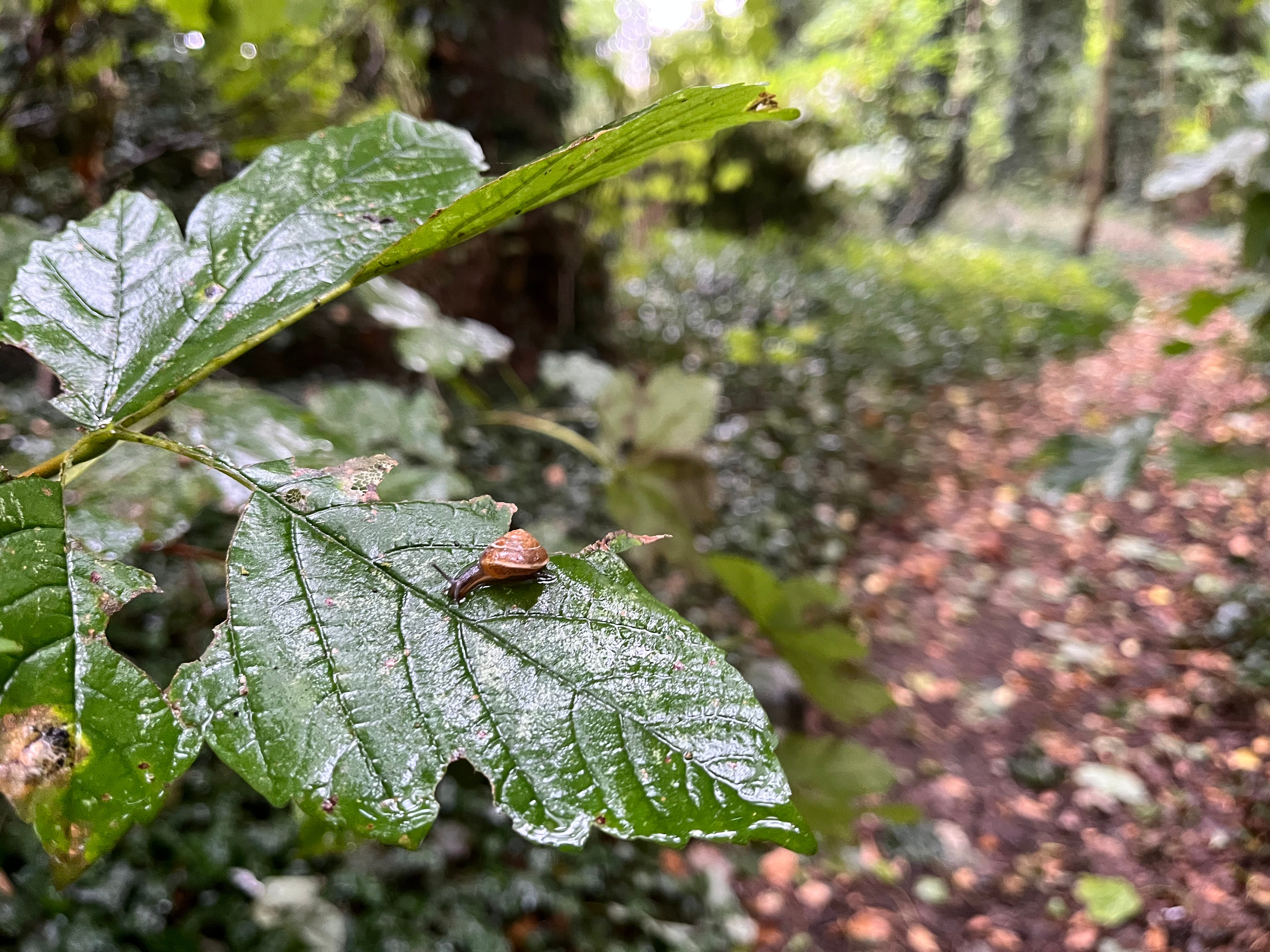 Snails, balancing precariously on leaves after a downpour.