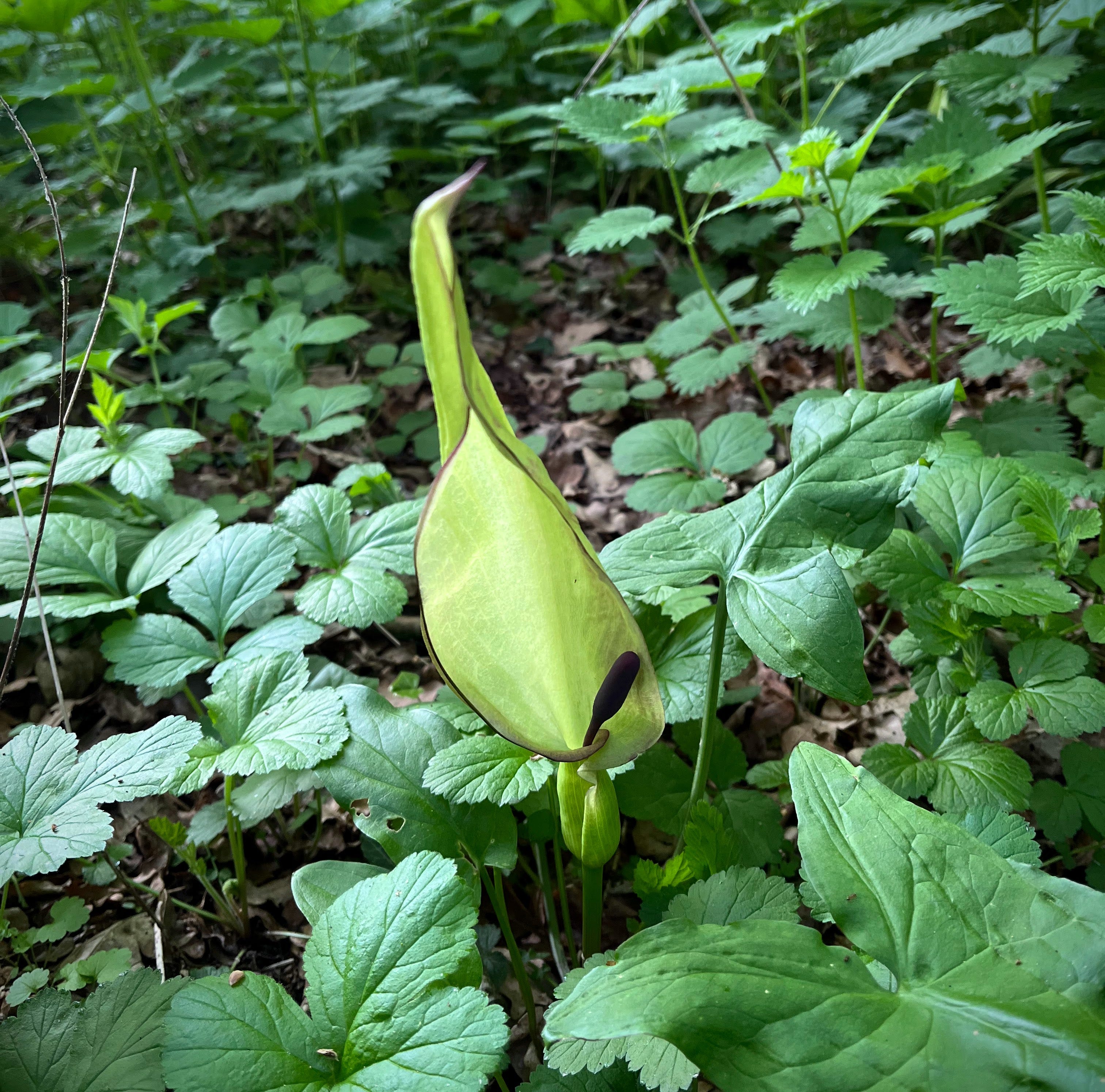 But the star of the wildflower show this week is the Arum Lily, also called ‘Lords & Ladies’ or ‘Cuckoo Pint’. It grows in the shade, often among the Wild Garlic that is now starting to fade after flowering. Arum Lilies are responsible for those spikes with big orange/red berries on the forest floor you’ll spot later in the year, which are great for birds but are very toxic to dogs. The rest of the plant is poisonous and an irritant, too.
