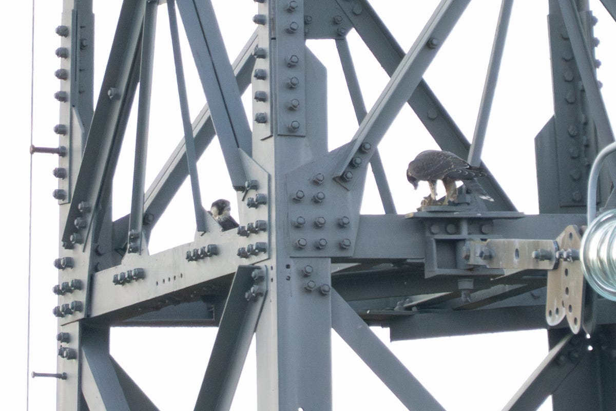 A couple of years ago the Peregrine nestlings at this location perished on an especially hot day. It was such a relief to see these ones fledged and healthy with an adult nearby. And then, on another pylon – a second adult. The male we had a fly-past from moments before.